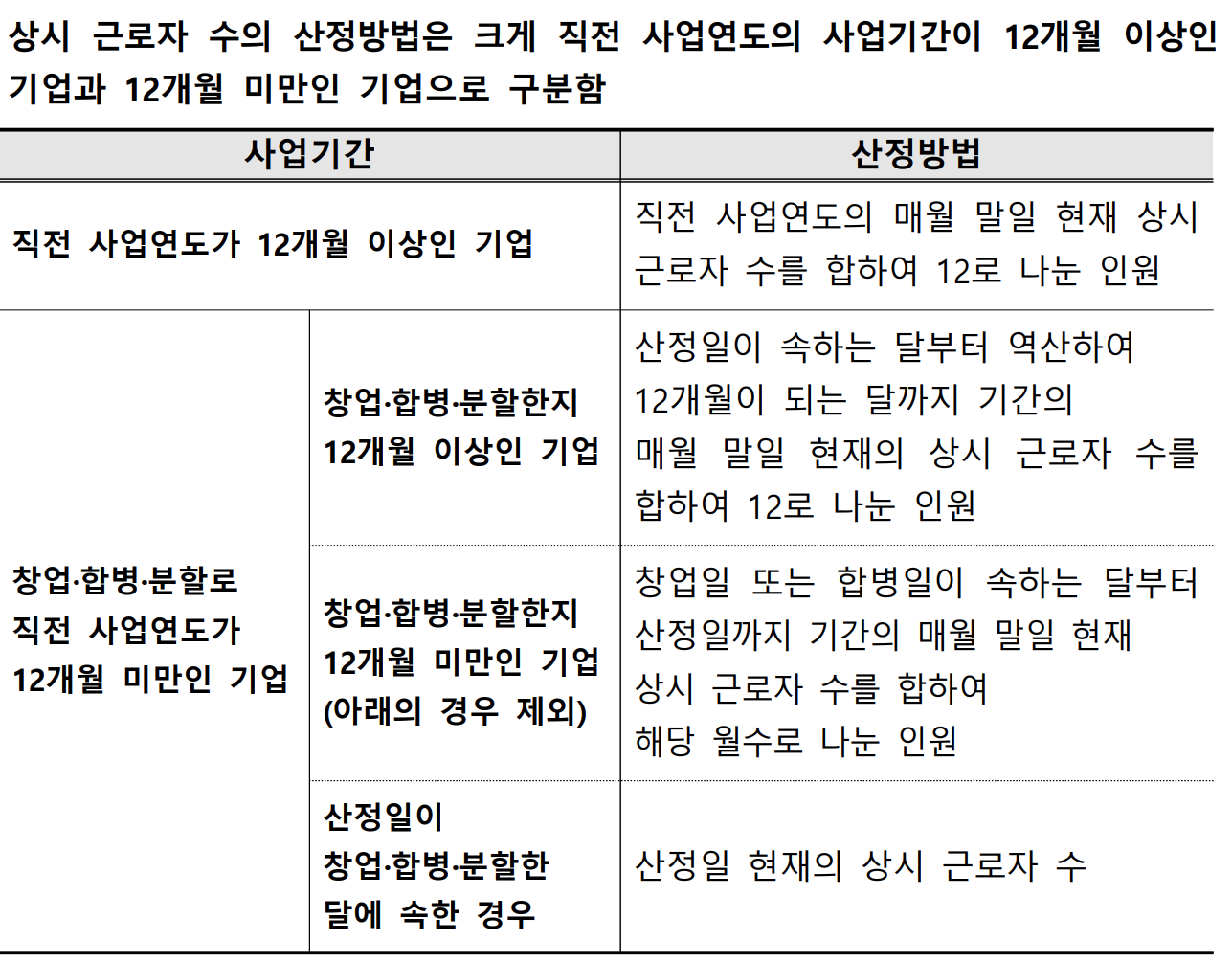 - 상시 근로자 수는 작년의 사업기간의 12개월인 경우에는 작년 말일의 근로자 수를 합하여 12로 나눈 인원(일용직 근로자 또는 1개월 동안 60시간 미만인 사람은 미 포함)