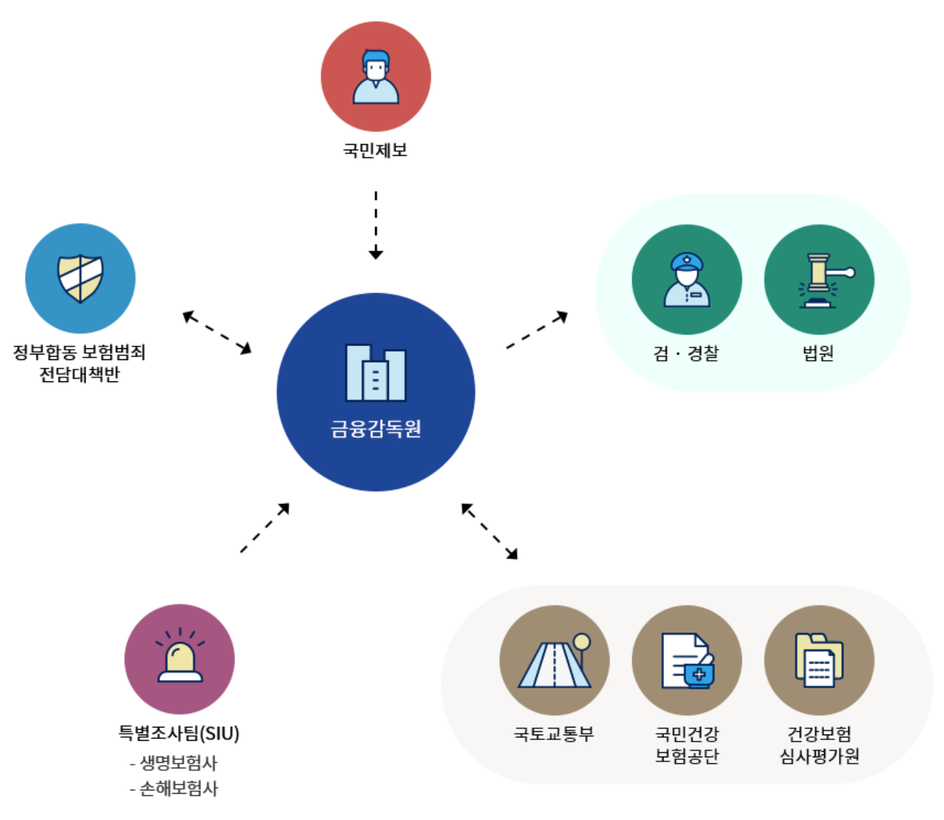 보험사기를 방지하기 위하여 금융감독원, 보험회사, 제보자, 경찰, 검찰, 건강보험심사평가원, 국민건강보험공단 등 여러 기관에서 합동으로 조사 업무를 진행하고 있습니다.
