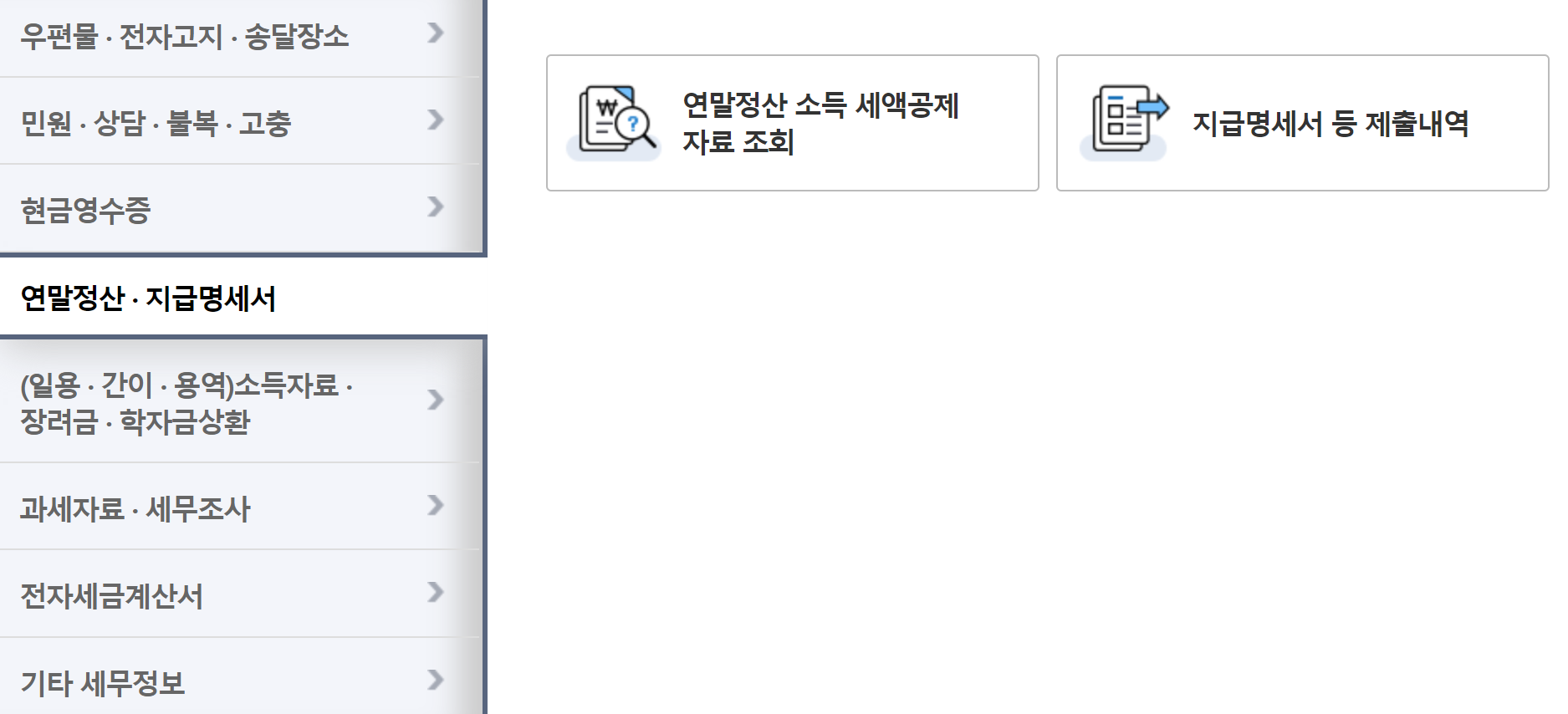 - 화면 중간 왼쪽 화면에 '연말정산, 지급명세서'에서 '지급명세서 등 제출내역'으로 접속하시기 바랍니다.