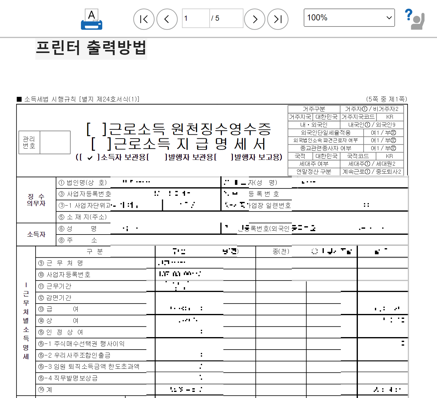 - 출력된 근로소득 원천징수영수증 발급이 되었는데, 출력을 하려면 화면 위에 'A' 프린터 화면 버튼을 누르면 출력이 됩니다.